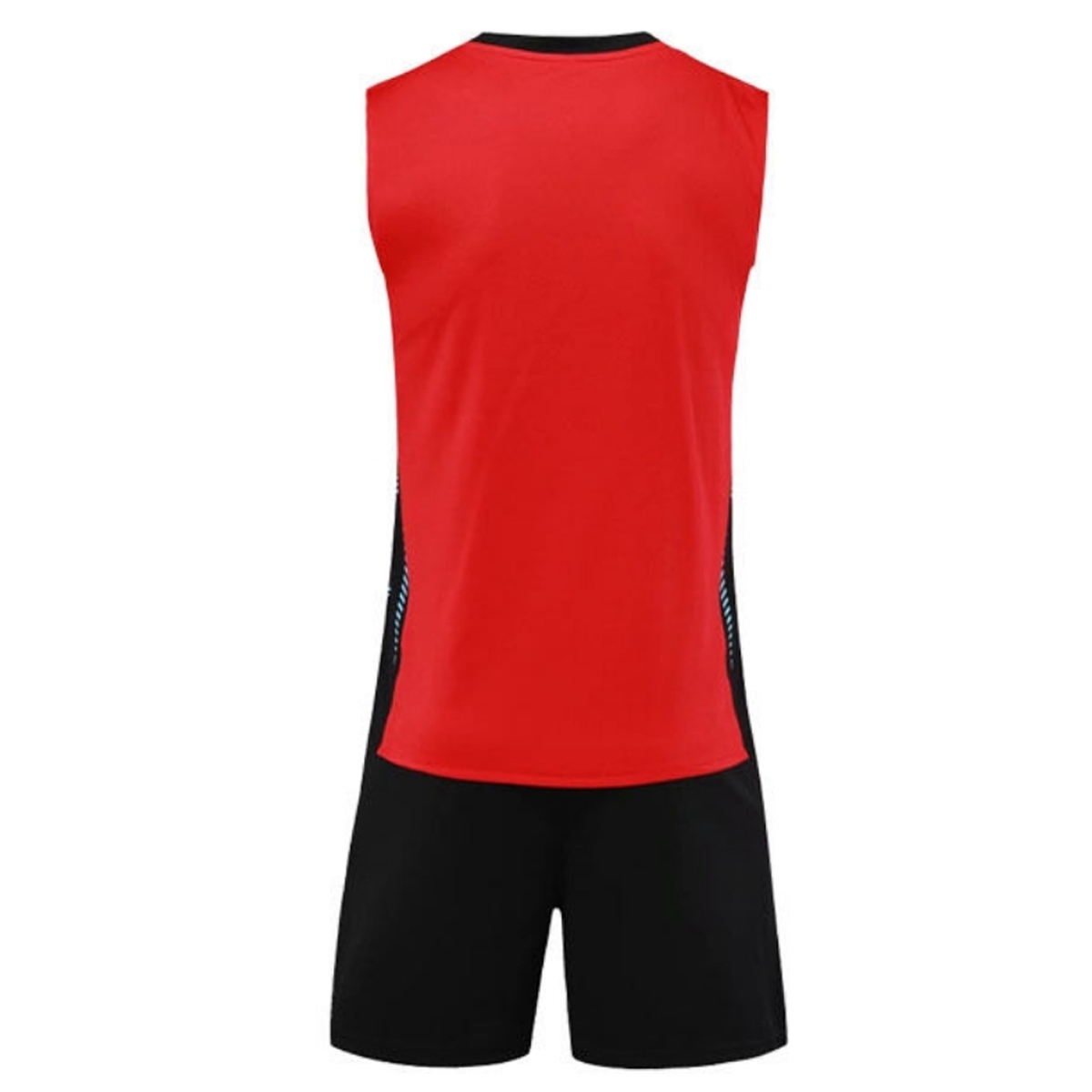 • Color Names: The uniform primarily features Solid Red and Black, with a light blue or Cyan V-neck collar.