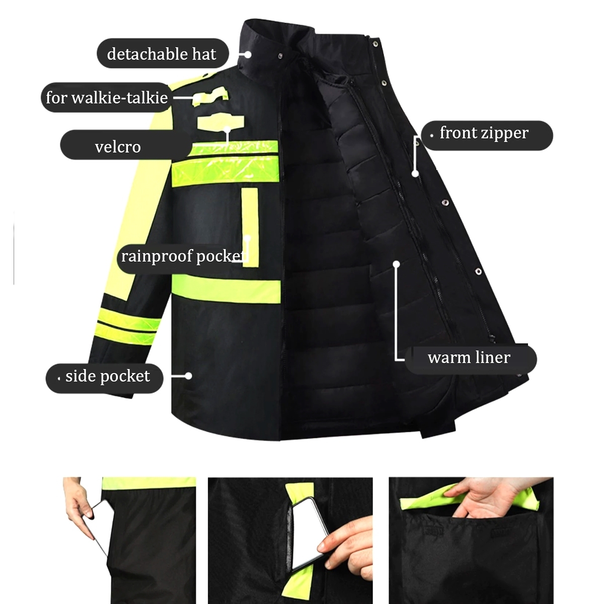 • Hi-Vis Lime / Fluorescent Yellow: The vibrant, "glowing" color used for the upper sleeves and the wide safety bands. This fluorescent shade converts UV light into visible light, making the wearer stand out during the day.